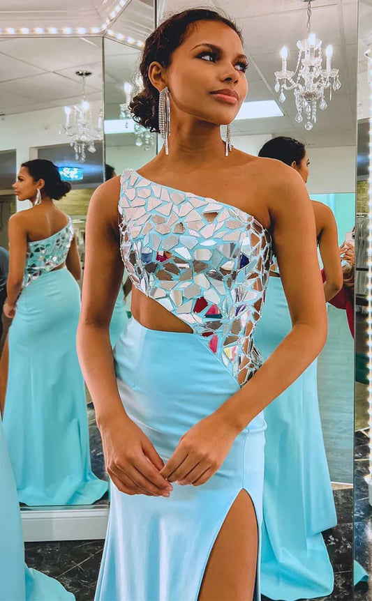 RP040-Sparkling Red Light Blue Mermaid One-Shoulder Cut Glass Mirror Cutout Long Formal Prom Evening Dress Special Party Gowns with Side Slit
