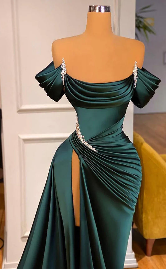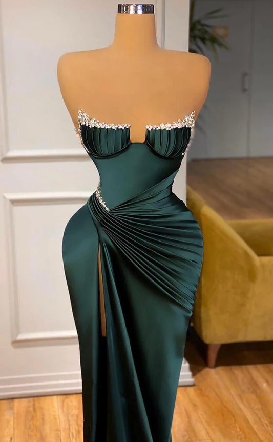RP485-Gorgeous Green Mermaid Spaghetti Ruched Crystals Sleeveless Satin Prom Evening Dresses Formal Party Gowns With Side Slit