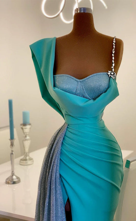 RP507-Charming Turquoise Mermaid Spaghetti Ruched Sequins Crystals Satin Long Prom Evening Dresses Formal Party Gowns With High Split
