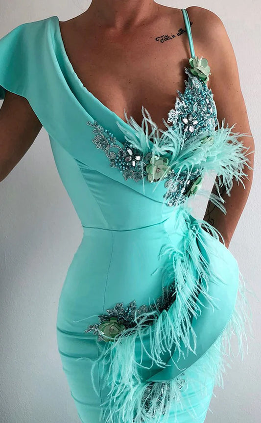 RP509-Charming Turquoise Mermaid Spaghetti Beaded Crystals Appliqued Feathers Satin Long Prom Evening Dresses Formal Party Gowns