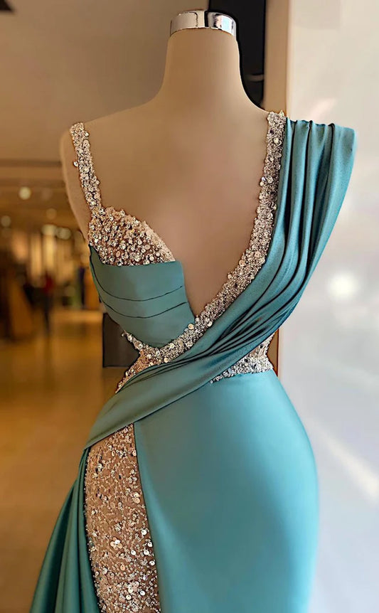 RP611-Luxury Mermaid Spaghetti Beads Sequins Ruched Sleeveless Long Prom Evening Dresses Formal Party Gowns