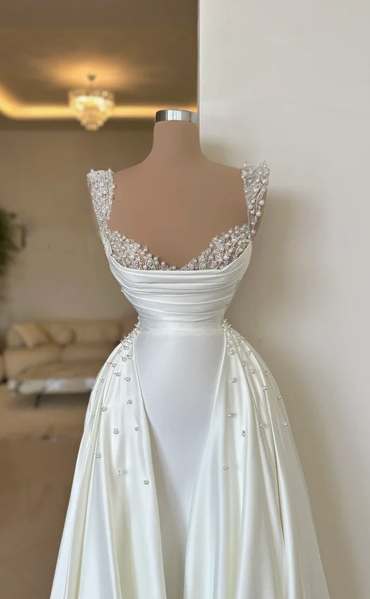 RP575-Luxury White Mermaid Spaghetti Beads Pearls Sleeveless Long Prom Evening Dresses Formal Party Gowns