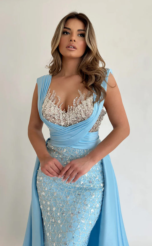 RP569-Luxury Sky Blue Mermaid Spaghetti Beads Sequins Ruched Sleeveless Prom Evening Dresses Formal Party Gowns With Train