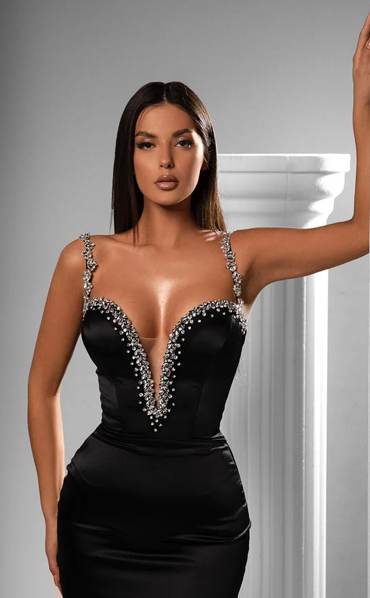 RP602-Elegant Black Mermaid Spaghetti Crystals Sleeveless Satin Long Prom Evening Dresses Formal Party Gowns