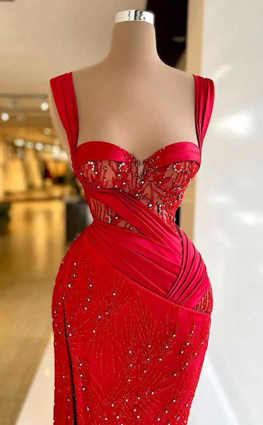 RP632-Classic Red Mermaid Spaghetti Strap Beads Sequins Ruched Sleeveless Long Prom Evening Dresses Formal Party Gowns With Slit