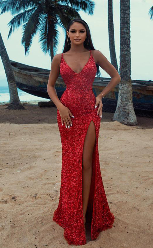 RP197-Red Trumpet Spaghetti Sequins Backless Long Prom Evening Dresses Formal Party Gowns With Slit