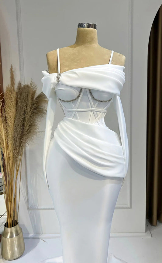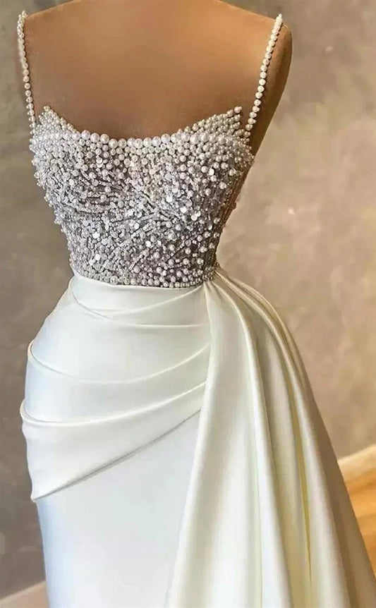 RP208-White Trumpet Spaghetti Beads Pleated Prom Dresses Formal Evening Party Gowns
