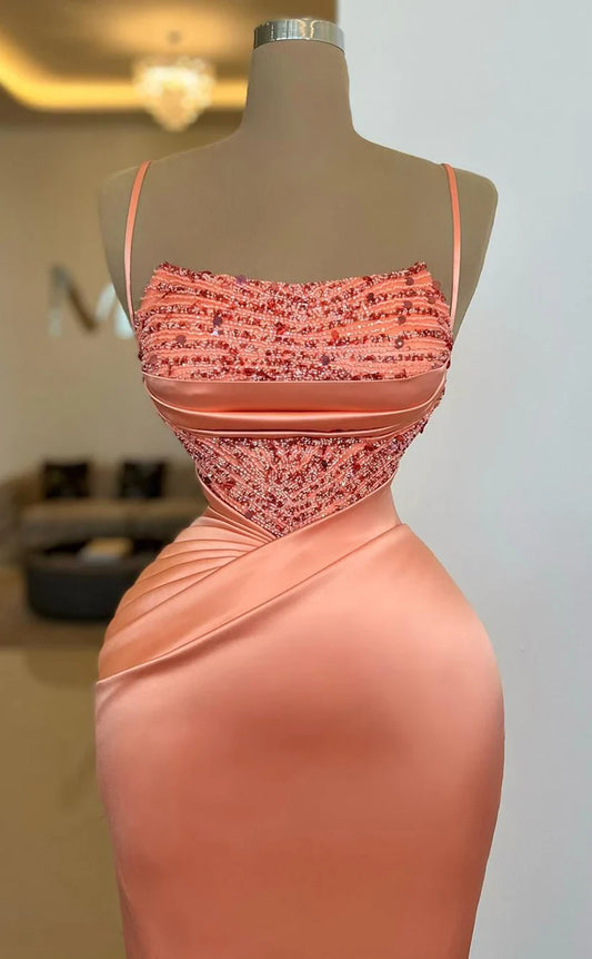 RP165-Pink Mermaid Spaghetti Sleeveless Beads Pearls Long Prom Evening Dresses Formal Party Gowns
