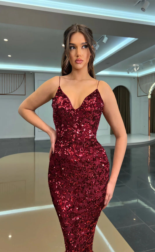 RP279-Burgundy Trumpet Spaghetti Beads Sequins Sleeveless Prom Evening Dresses Formal Party Gowns