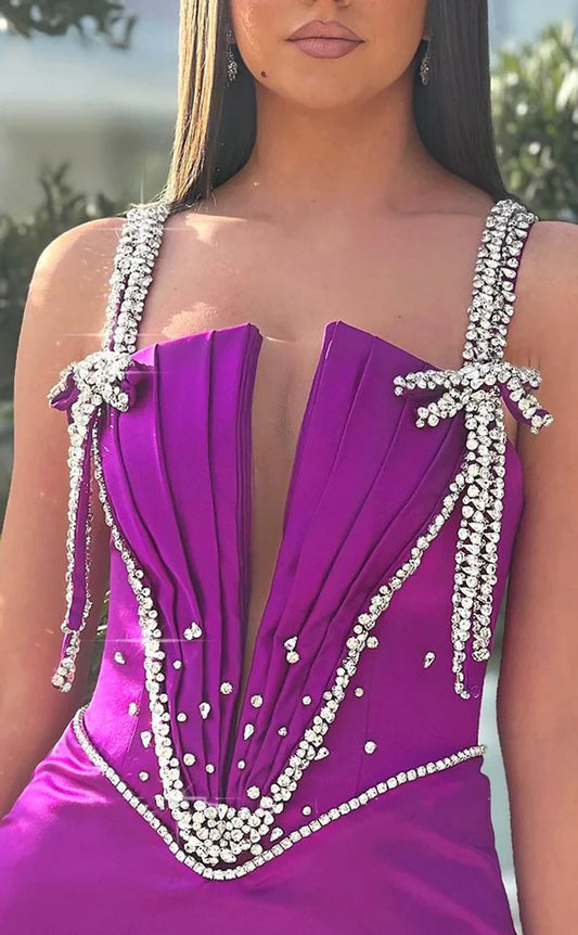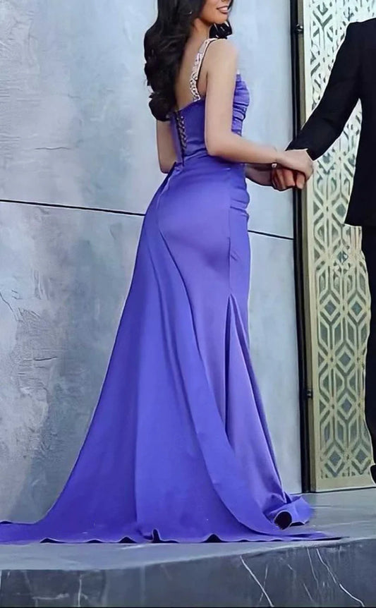 RP1927-Modern Purple Mermaid Spaghetti Pleated Crystals Sleeveless Satin Prom Evening Dresses Formal Party Gowns With Slit
