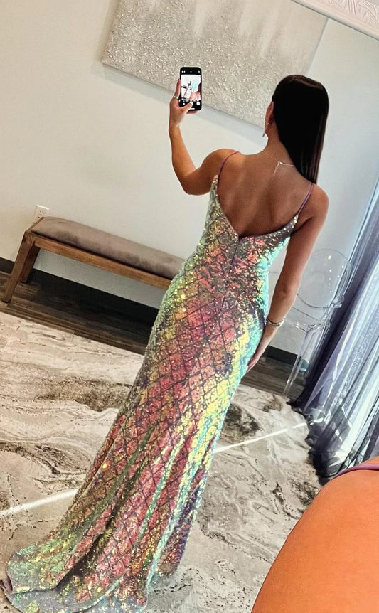 RP1952-Sparkling Colourful Mermaid Spaghetti Beaded Sequins Sleeveless Prom Evening Dresses Formal Party Gowns With Slit