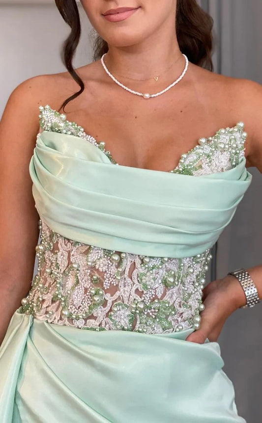 RP1921-Modern Mint Mermaid Sweetheart Appliqued Pearls Sleeveless Satin Prom Evening Dresses Formal Party Gowns With Slit