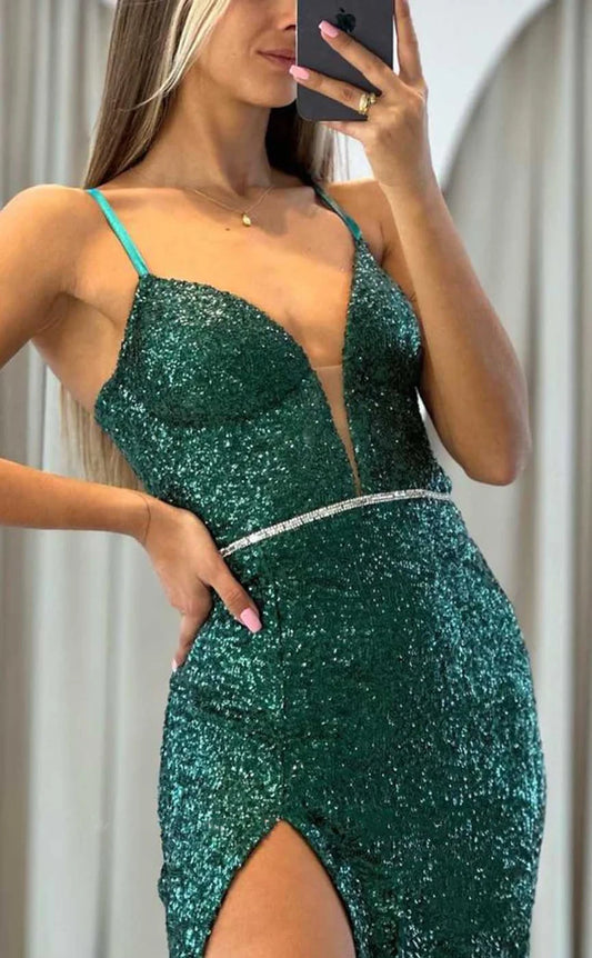 RP1924-Sparkling Green Mermaid Spaghetti Sequins Sleeveless Prom Evening Dresses Formal Party Gowns With Slit