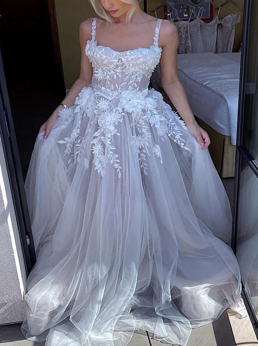 Elegant & Gorgeous A-Line Wedding Dresses Spaghetti Appliqued Beads Tulle Bridal Gowns Custom With Side Slit