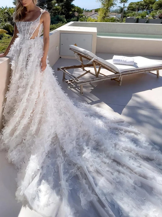Classic & Simple A-Line Wedding Dresses Spaghetti Pleated Flowers Sleeveless Tulle Sweep Train Bridal Gowns With Slit