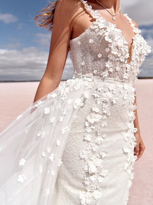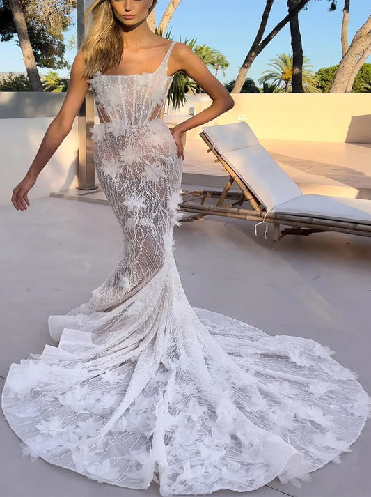 Charming & Elegant Mermaid Wedding Dresses Spaghetti Flowers Sleeveless Tulle Sweep Train Bridal Gowns Custom Made