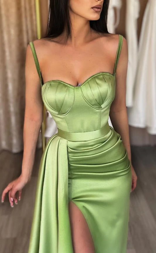 RP1806-New Olive Mermaid Spaghetti Ruched Sleeveless Satin Prom Evening Dresses Formal Party Gowns With Slit