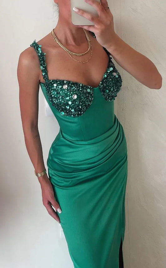RP1833-Elegant Green Mermaid Spaghetti Beaded Ruched Sleeveless Satin Prom Evening Dresses Formal Party Gowns With Slit