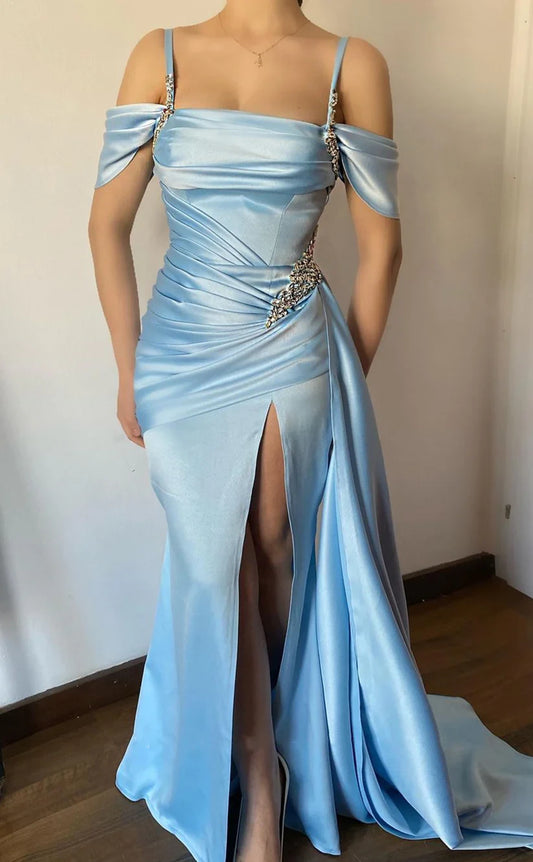 RP1830-New Sky Blue Mermaid Spaghetti Ruched Crystals Sleeveless Satin Prom Evening Dresses Formal Party Gowns With Slit