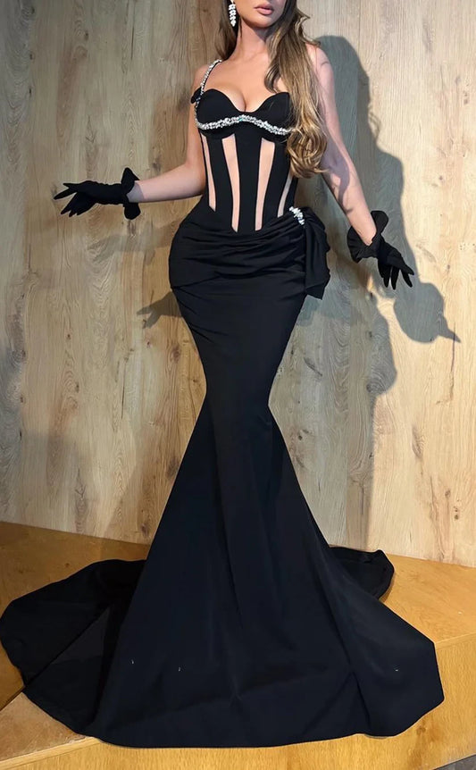 RP1886-New Black Mermaid Spaghetti Pleated Crystals Sleeveless Satin Prom Evening Dresses Formal Party Gowns With Train