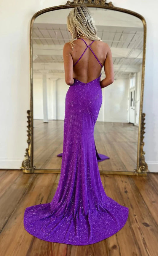 RP1409-Elegant Purple Mermaid Spaghetti Ruched Crystals Sleeveless Prom Evening Dresses Formal Party Gowns With Slit