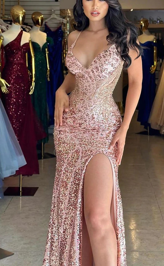 RP1363-Sparkling Pink Mermaid Spaghetti Beads Sequins Sleeveless Prom Evening Dresses Formal Party Gowns With Slit