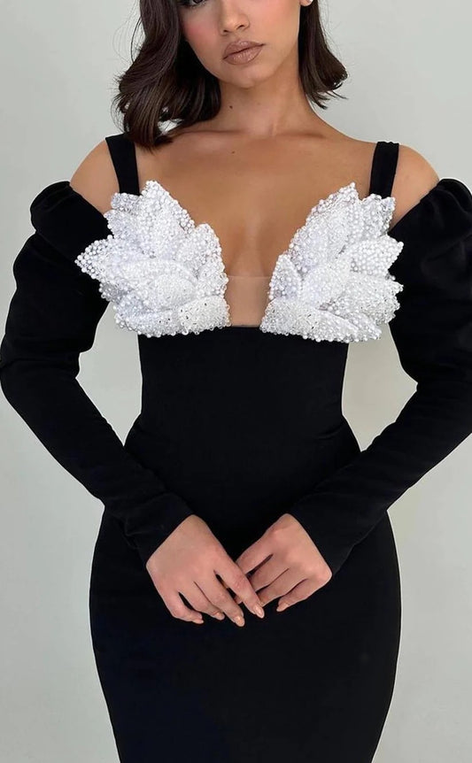 RP1400-Unique Black Mermaid Spaghetti Appliqued Beaded Long Sleeves Prom Evening Dresses Formal Party Gowns