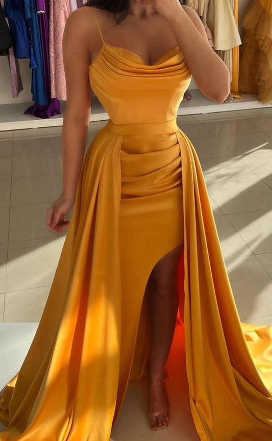 RP1456-Gorgeous Yellow Mermaid Spaghetti Ruched Crystals Sleeveless Satin Prom Evening Dresses Formal Party Gowns With Slit