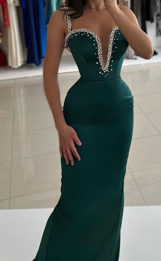 RP1423-Elegant Green Mermaid Spaghetti Ruched Crystals Sleeveless Prom Evening Dresses Formal Party Gowns