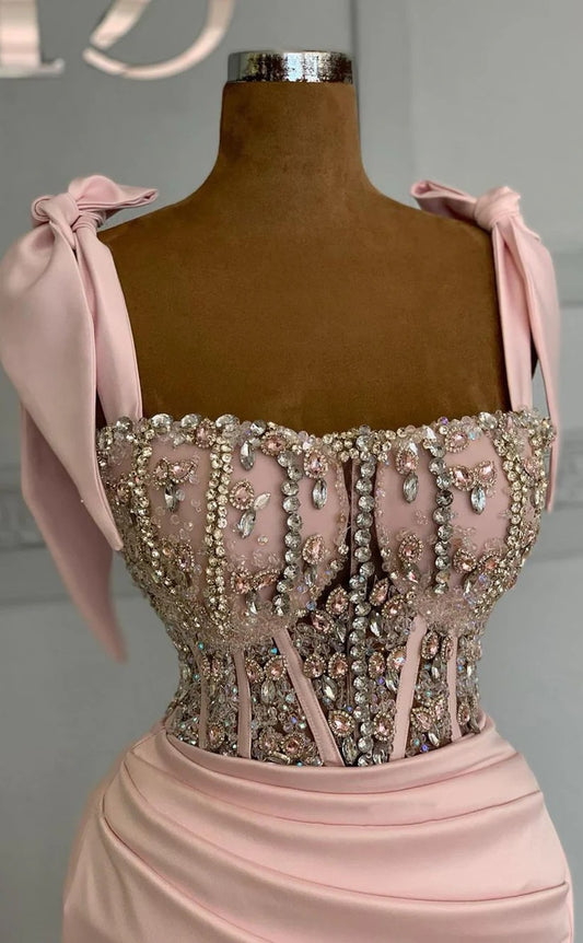 RP1296-Elegant Mermaid Spaghetti Ruched Crystals Sleeveless Prom Evening Dresses Formal Party Gowns With Slit
