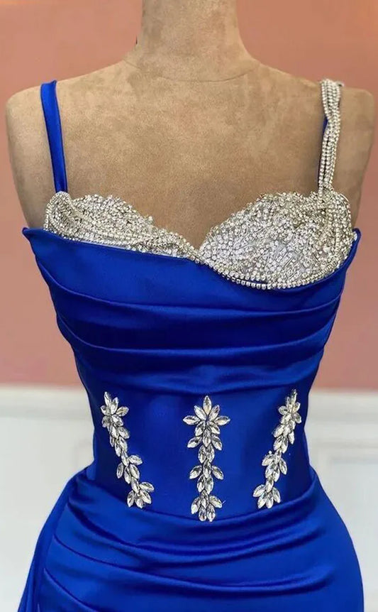 RP1216-Elegant Royal Blue Mermaid Spaghetti Beads Crystals Sleeveless Satin Prom Evening Dresses Formal Party Gowns With Split