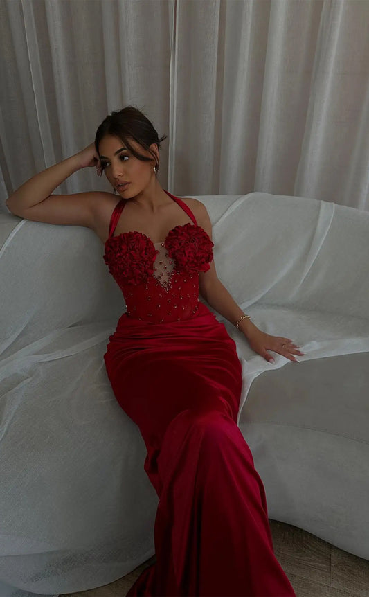 RP1220-Elegant Red Mermaid Spaghetti Beads Sleeveless Satin Prom Evening Dresses Formal Party Gowns With Handmade Flowers