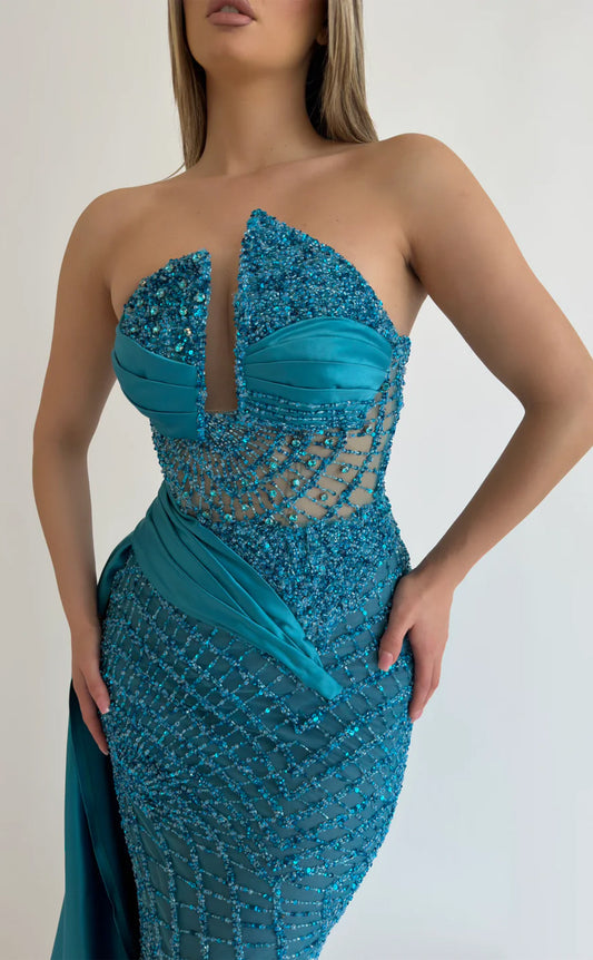 RP653-Sparkling Peacock Blue Mermaid Strapless Beads Sleeveless Sequins Long Prom Evening Dresses Formal Party Gowns With Slit