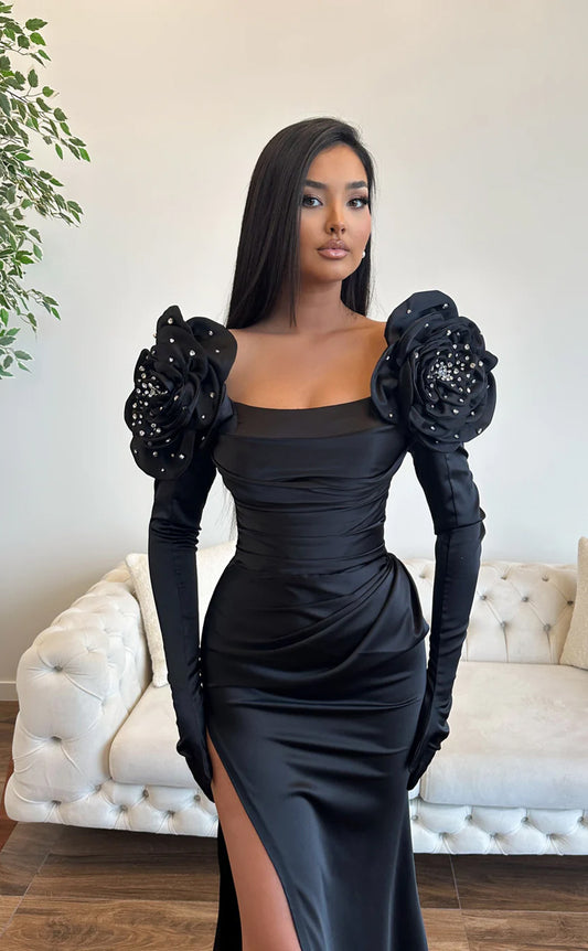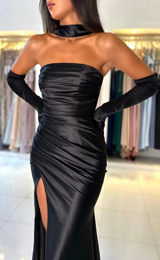 RP735-Elegant Black Mermaid Strapless Ruched Long Sleeves Long Prom Evening Dresses Formal Party Gowns With Slit