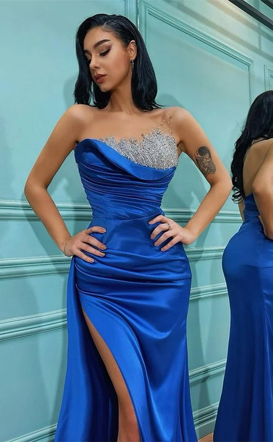 RP708-Elegant Mermaid Strapless Ruched Beaded Sleeveless Long Prom Evening Dresses Formal Party Gowns With Slit