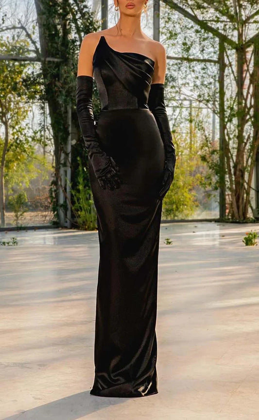 RP749-Elegant Black Mermaid Strapless Ruched Long Sleeves Long Prom Evening Dresses Formal Party Gowns