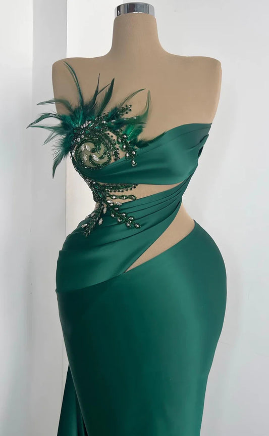 RP809-New Arrivals Mermaid Green Strapless Beads Feathers Long Prom Evening Dresses Formal Party Gowns