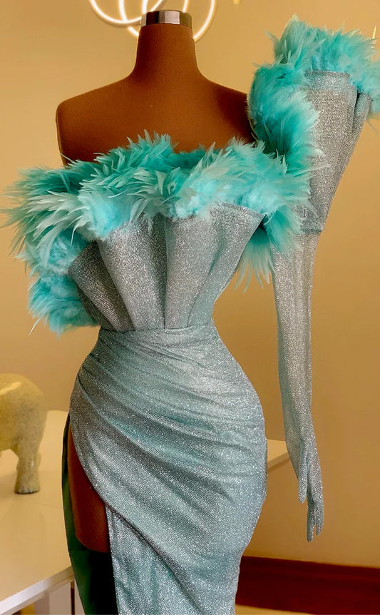 RP508-Charming Turquoise Mermaid Strapless Sequins Feathers SatinLong Sleeves Prom Evening Dresses Formal Party Gowns With High Split