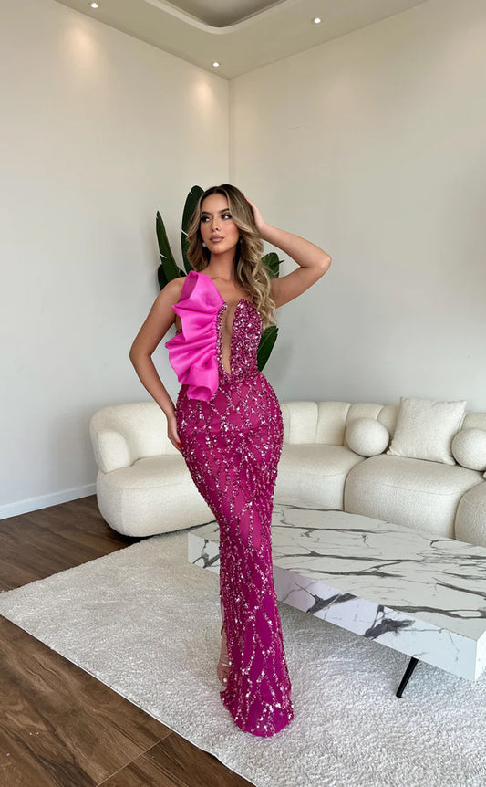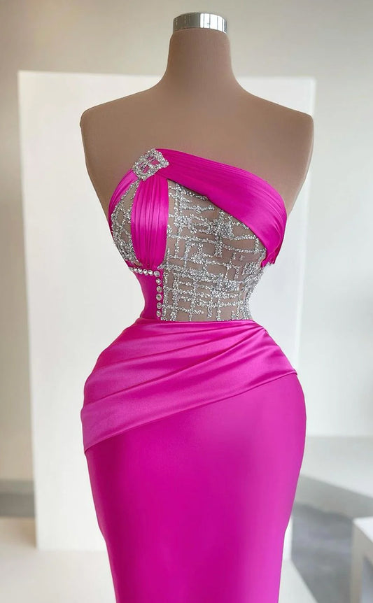 RP530-Luxurious Fuchsia Mermaid Strapless Ruched Sequins Pearls Sleeveless Prom Evening Dresses Formal Party Gowns