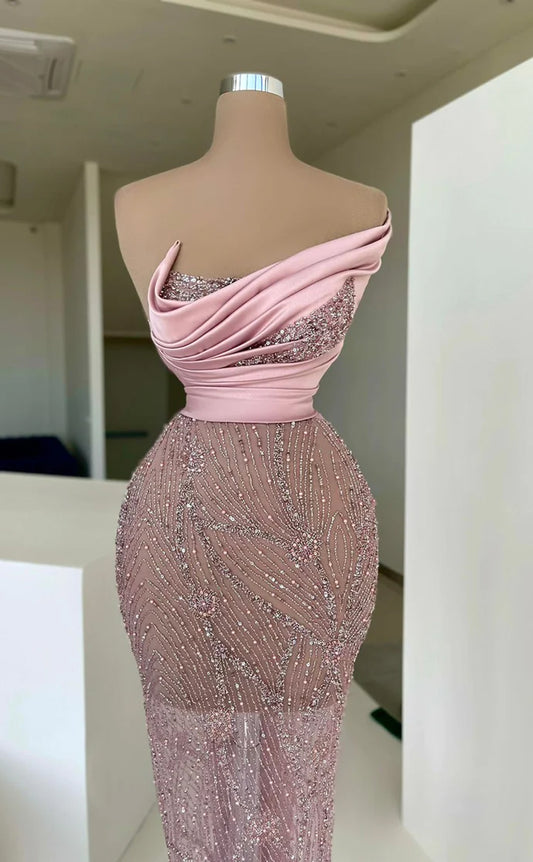 RP567-Luxury Pink Mermaid Strapless Beads Sequins Ruched Sleeveless Floor Length Prom Evening Dresses Formal Party Gowns