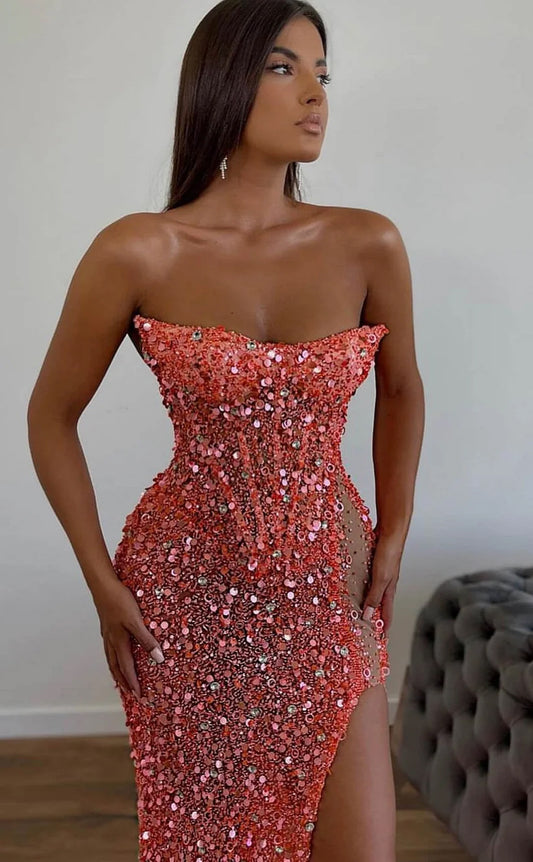 RP448-Gorgeous Mermaid Strapless Sequins Sleeveless Long Prom Evening Dresses Formal Party Gowns With Side Slit
