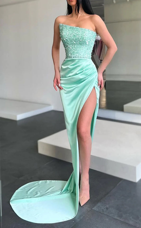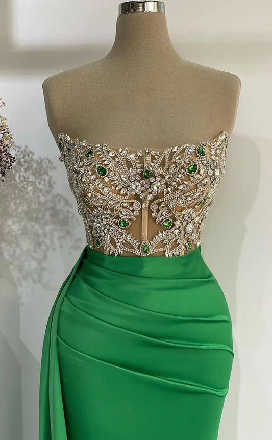RP418-Elegant Green Mermaid Strapless Crystals Beads Ruched Sleeveless Long Prom Evening Dresses Formal Party Gowns With Slit