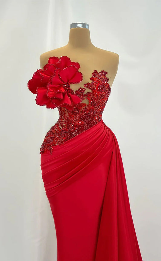 RP285-Gorgeous Red Mermaid Strapless Beads Pleated Sleeveless Prom Evening Dresses Formal Party Gowns With Flowers