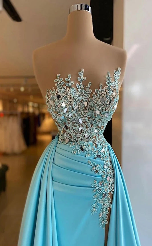RP364-Sky Blue Mermaid Strapless Beaded Appliqued Pleated Prom Evening Dresses Formal Party Gowns