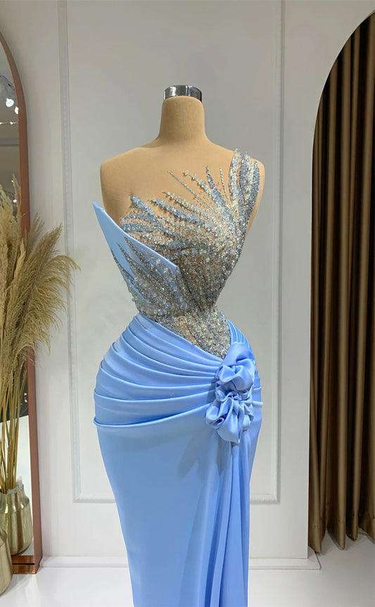 RP334-Sky Blue Mermaid Strapless Beaded Crystals Pleated Sleeveless Prom Evening Dresses Formal Party Gowns With Handmade Flower