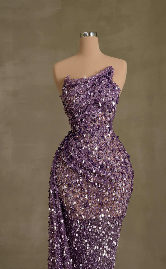 RP265-Purple Trumpet Strapless Beads Crystals Sequins Prom Evening Dresses Formal Party Gowns
