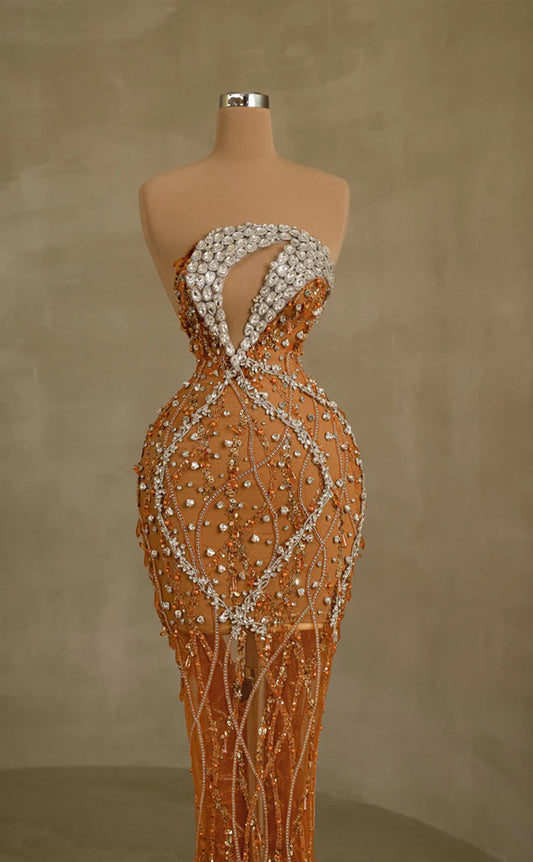 RP250-Orange Trumpet Strapless Beads Crystals Feather Prom Evening Dresses Formal Party Gowns