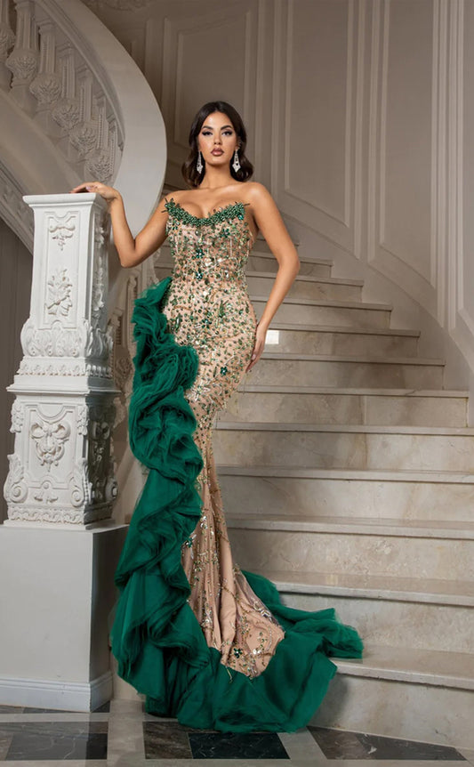 RP238-Sparkling Mermaid Strapless Beads Pearls Ruffles Long Prom Evening Dresses Formal Party Gowns With Slit