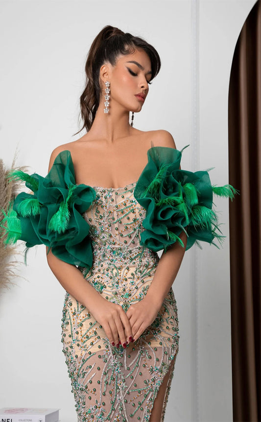 RP235-Sparkling Trumpet Strapless Beads Pearls Feather Long Prom Evening Dresses Formal Party Gowns With Slit