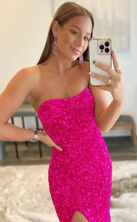 RP141-Hot Pink Mermaid Strapless Sequins Sleeveless Long Prom Evening Dress Formal Party Gowns With Slit